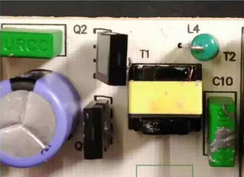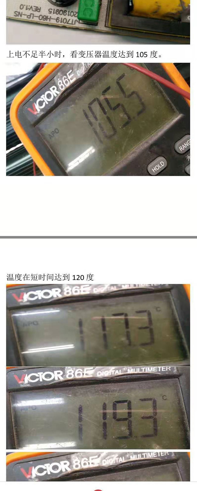 對客戶的電路板上電老化測試,使用專用的溫度測試工具,明顯發(fā)現(xiàn)了變壓器溫度過高的問題。