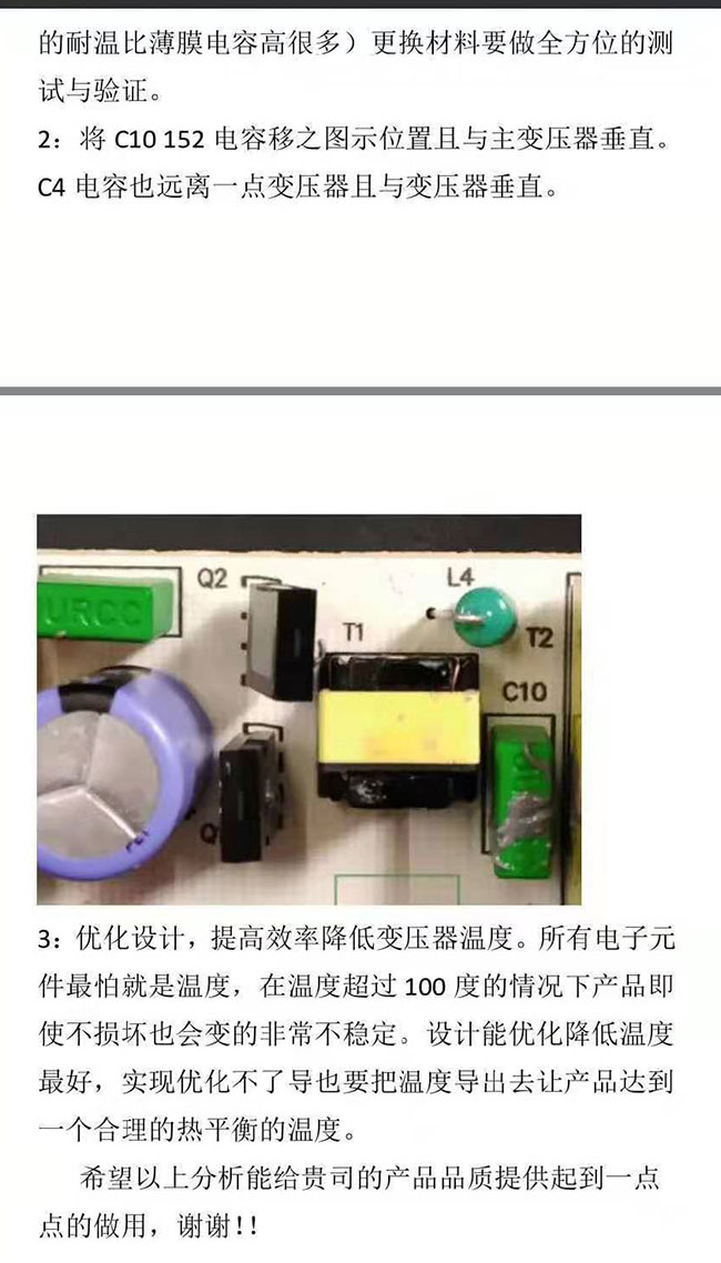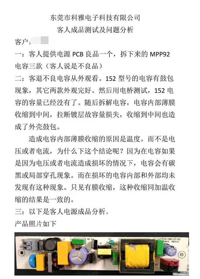 找到以后,科雅的售后并沒有停止,甚至從產(chǎn)品設計的角度,幫助客戶改進產(chǎn)品設計,只要根據(jù)科雅的優(yōu)化建議去改進,以后就再也不會出現(xiàn)電容損壞的現(xiàn)象。